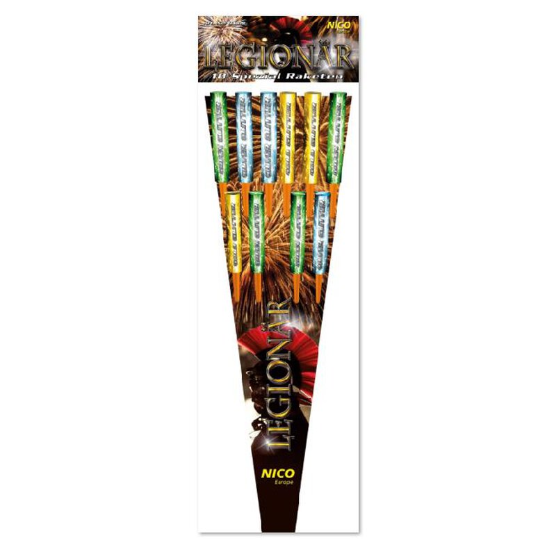 10 Spezial-Raketen mit grünem, goldenem oder silbernem Glittereffekt.